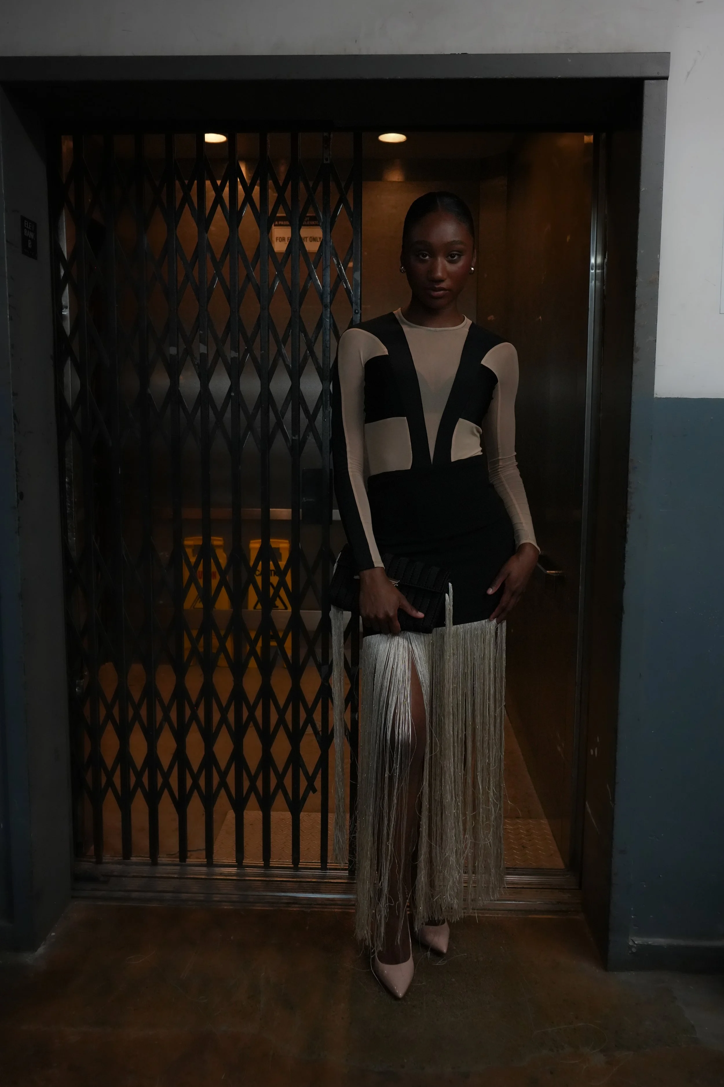 BLACK CREPE SKIRT WITH GOLD FRINGE | DIGITAL/PHYSICAL