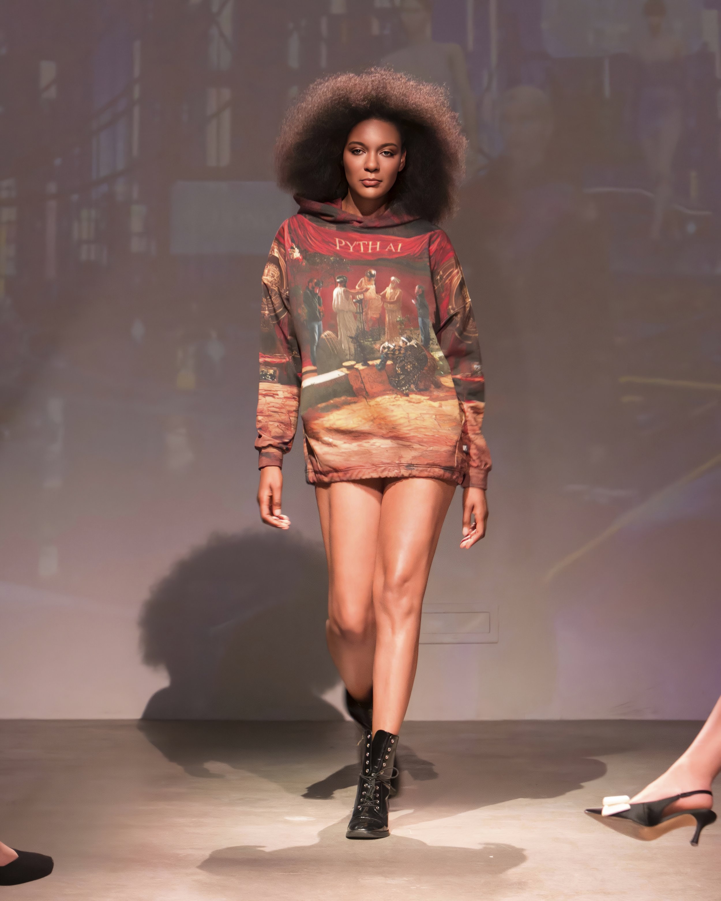 STEPHEN VINEBURG PYTH AI HOODIE | DIGITAL/PHYSICAL BEEN THERE, DONE THAT HOODIE| DIGITAL/PHYSICAL BLACK & NUDE MESH BODYSUIT | DIGITAL/PHYSICAL BLACK CREPE SKIRT WITH GOLD FRINGE | DIGITAL/PHYSICAL stephen vineburg